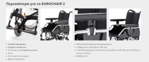 Το EUROCHAIR 2 είναι ένα ελαφρού τύπου χειροκίνητο αμαξίδιο από αλουμίνιο. Είναι πτυσσόμενο με ενισχυμένη χιαστή και έχει ρυθμιζόμενα και προσθαφαιρούμενα υποπόδια και πλαϊνά. Στον στάνταρτ εξοπλισμό του συμπεριλαμβάνονται αντιανατρεπτικοί τροχοί, ζώνη και μαξιλάρι καθίσματος 5cm.