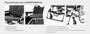 Το EUROCHAIR XXL είναι ένα ελαφρού τύπου χειροκίνητο αμαξίδιο από αλουμίνιο, ιδανικό για XXL άτομα. Είναι πτυσσόμενο με ενισχυμένη χιαστή και έχει ρυθμιζόμενα και προσθαφαιρούμενα υποπόδια και πλαϊνά. Το ύψος και η πλάτη μπορούν να ρυθμιστούν στην βέλτιστη για τον χρήστη θέση.