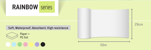 Οδοντιατρικά ρολά σε χρώματα μήκους 50m, μεγάλης απορροφητικότητας και αντοχής, για την προστασία του εξοπλισμού και του ασθενή.