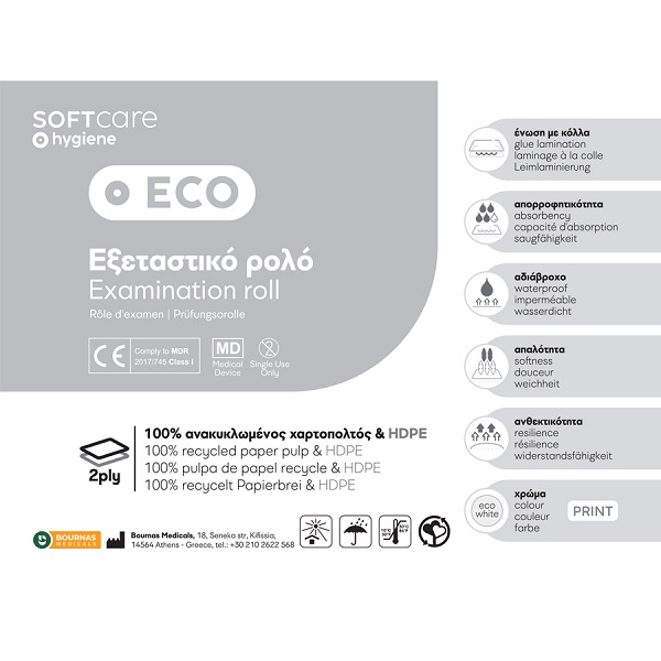 Το Ιατρικό Εξεταστικό ρολό Soft Care Eco αποτελείται από ένα φύλλο ανακυκλωμένου χαρτοπολτού και ένα φύλλο πολυαιθυλενίου υψηλής πυκνότητας (HDPE), ενωμένα με ειδική κόλλα.