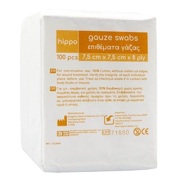 HIPPO Γάζα υδρόφιλη διπλωμένη απλή 7,5 cm X 7,5 cm 8ply