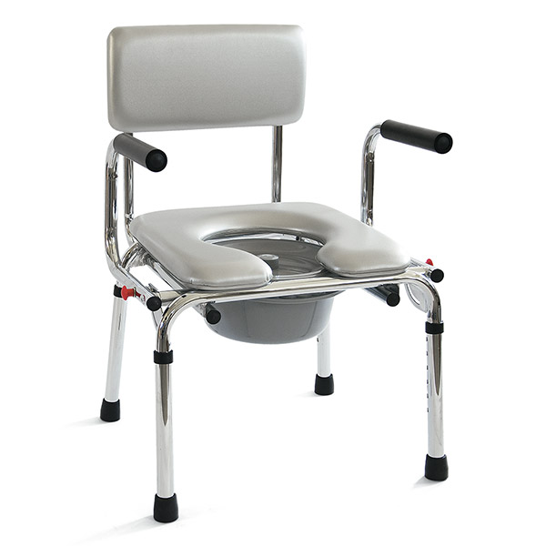 Κατασκευή από επιχρωµιωµένο µέταλλο. Πλαϊνά στηρίγµατα “drop down” µε µαλακή επένδυση στις χειρολαβές. Αδιάβροχο και άνετο κάθισµα. Το ύψος είναι ρυθµιζόµενο ώστε να εφαρµόζει πάνω από την λεκάνη της τουαλέτας. Το εύρος της πλάτης ρυθµίζεται σε τρεις θέσεις επιλογής. Αφαιρούµενο δοχείο µε καπάκι. Αντιολισθητικές τάπες.