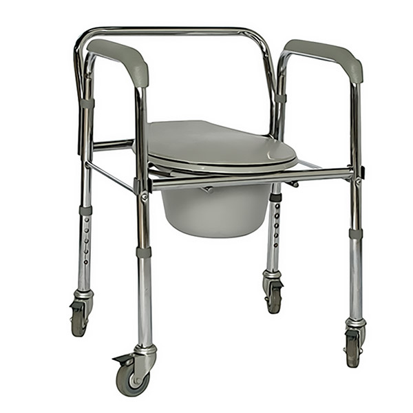 Κατασκευή από επιχρωµιωµένο µέταλλο. Χρησιµοποιείται ως ανυψωτικό τουαλέτας, ως καρέκλα µπάνιου και ως κάθισµα µε δοχείο WC το οποίο αφαιρείται και πλένεται. Ρυθµιζόµενο ύψος για σωστή εφαρµογή πάνω από την τουαλέτα. Φέρει τέσσερεις τροχούς, οι δύο οπίσθιοι µε φρένο. Είναι πτυσσόµενη για αποθήκευση και εύκολη µεταφορά.